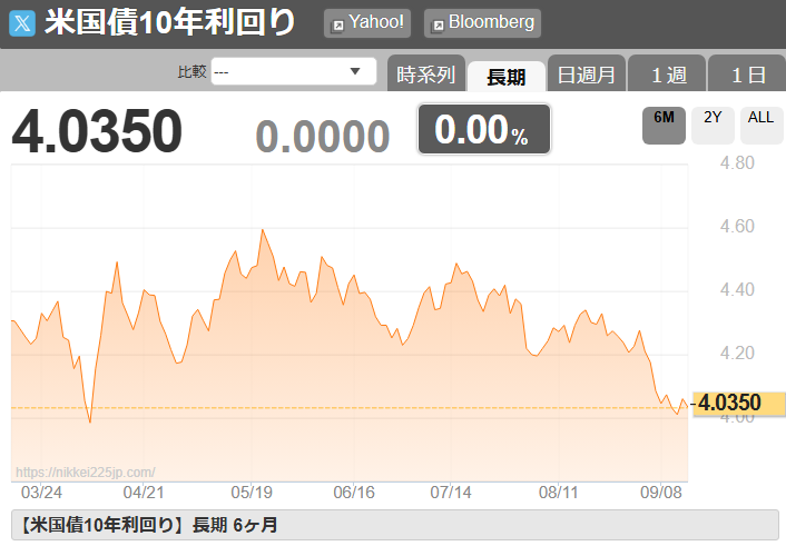 実勢金利の代表格である米国10年国債利回りが下がってきたら、いわゆる「金利が下がってきた」と言える。そしてここのところ10年国債利回りが実際に下がってきたことが確認できます。